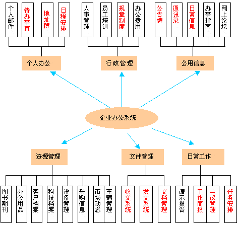企業(yè)辦公系統(tǒng)的主要目標(biāo)是實(shí)現(xiàn)企業(yè)辦公及事務(wù)管理,企業(yè)辦公效率、節(jié)約辦公經(jīng)費(fèi)、創(chuàng)建企業(yè)文化。是辦公系統(tǒng)與管理信息系統(tǒng)的結(jié)合,系統(tǒng)有多個(gè)單獨(dú)模塊組成,體系結(jié)構(gòu)如下: